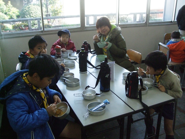 自分たちでついたお餅と豚汁、ぜんざいで昼食です。
