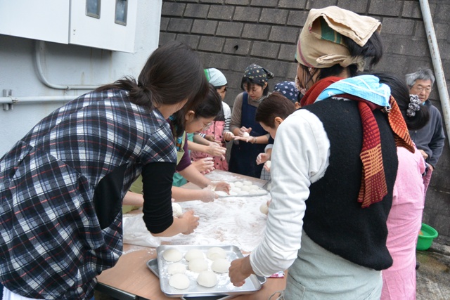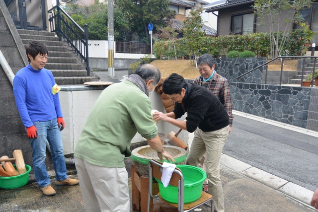 食事はついたばかりのお餅を入れた豚汁、ぜんざい、粕汁(大人用?)です。