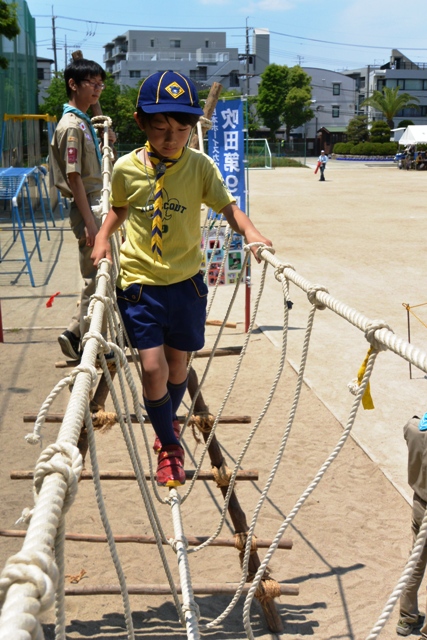 モンキーブリッジに挑戦(建てたばかりの試し渡りも兼ねて笑)