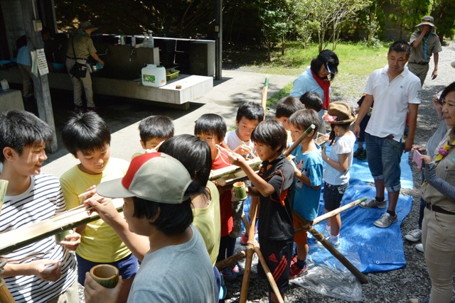 カブ隊は北千里わくわくの郷にて、中型構築物製作?(ベンチャーか!)として、そうめん流しを行いました。