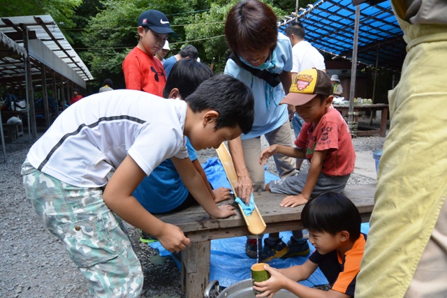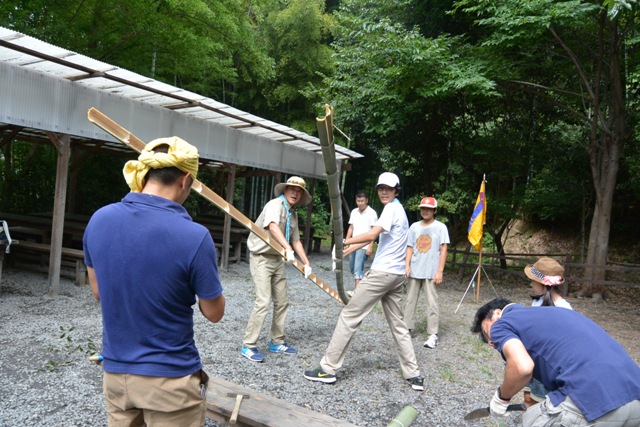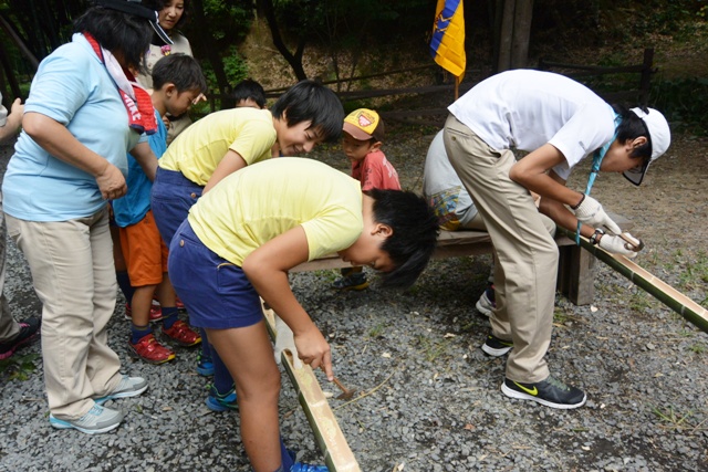 カブ隊指導者はもちろん、各隊からの応援指導者&俊英のスカウト、そして保護者も参加して、そうめん流し台を製作。