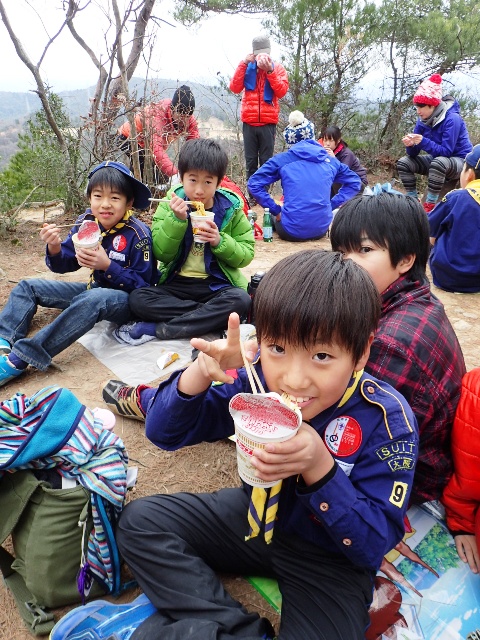 最高峰では温かいカップ麺の昼食です