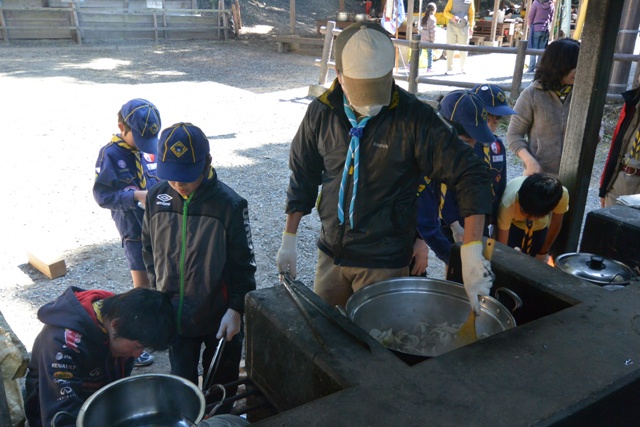 そして新年度よりカブ隊指導者をしていただける方々5名に、団内研修として、ごはんとお鍋の飯ごう炊さんとロープ結びと基本動作。