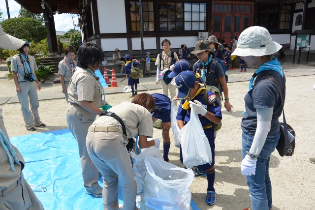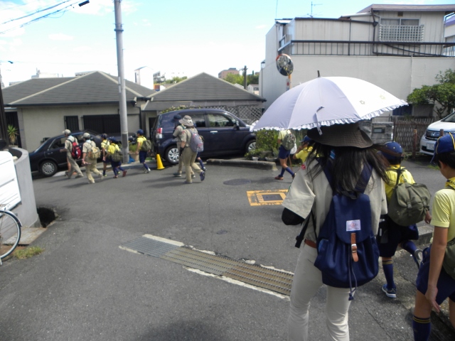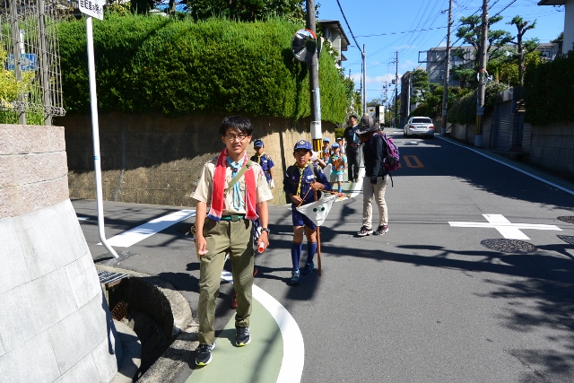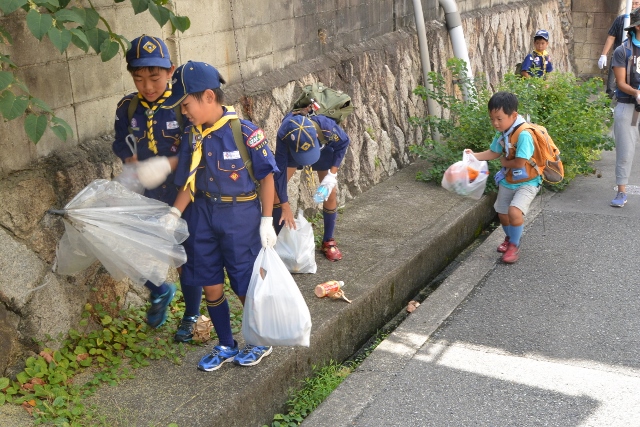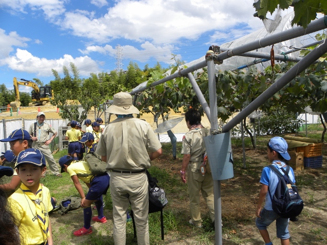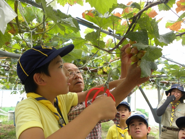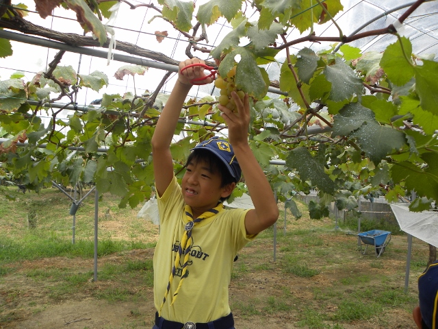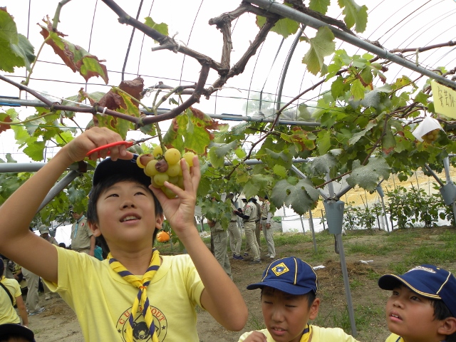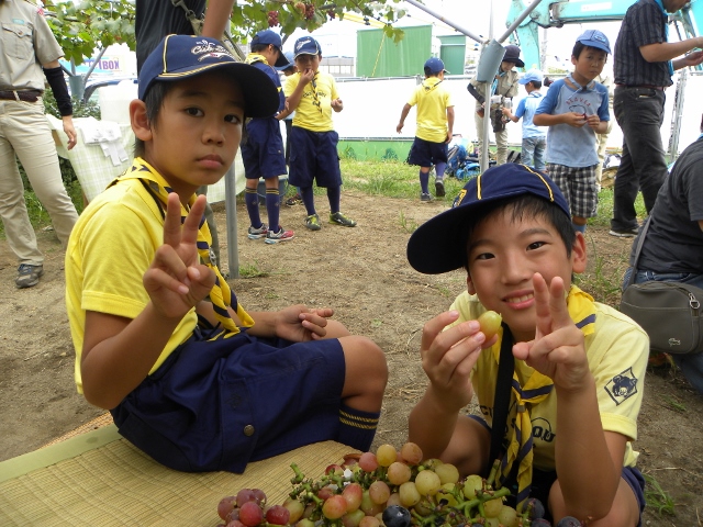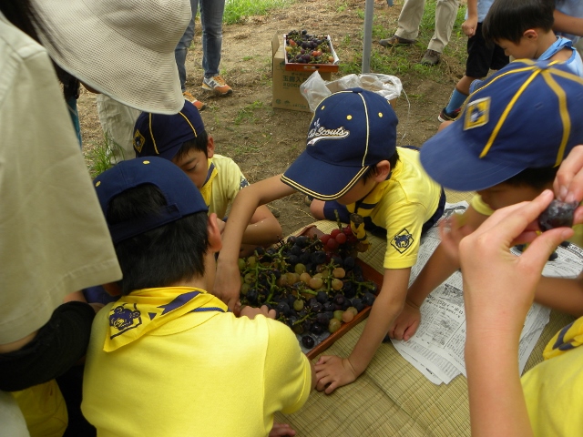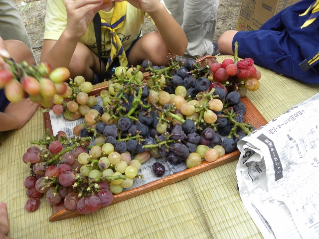 9月4日の隊集会は、カントリー大作戦(地域のごみ拾い)とぶどう狩りをしました。 まずカントリー大作戦は、3組に分かれて、ビーバー隊と合同で行いました。 みんなで手分けして、千里山地区のごみを拾いました 拾った後は、千里山寺でごみを集めました。 昼食後は、ぶどう狩りに出発です。 千里山寺から、約15分ほどでした。 順番は組長同士でじゃんけんです 手伝ってもらいながら、全員ぶどう狩り体験をしました。 こんなにたくさん採れました。 その後はみんなで試食会です。 おなかいっぱいになりました(笑) 千里山という住宅街で、ぶどう狩りが体験出来るのもボーイスカウトならではですね。