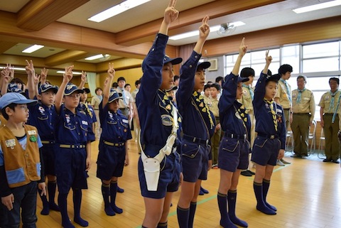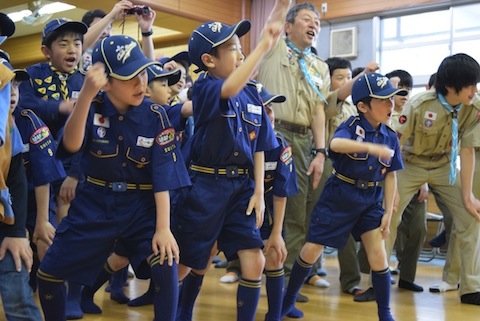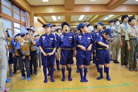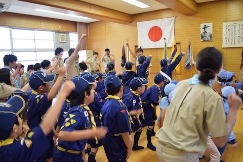 スカウトたちは「ウォー」と元気よく呼応し、隊長を中心に輪を作ります。