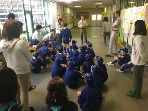 組ごとに分かれ、デンリーダーが組集会を始めています。まずは「いつもの持ち物」の内容を把握をするため、忘れ物チェックです。組ごとに忘れ物の数をカウントされています。わぁー厳しい(苦笑)