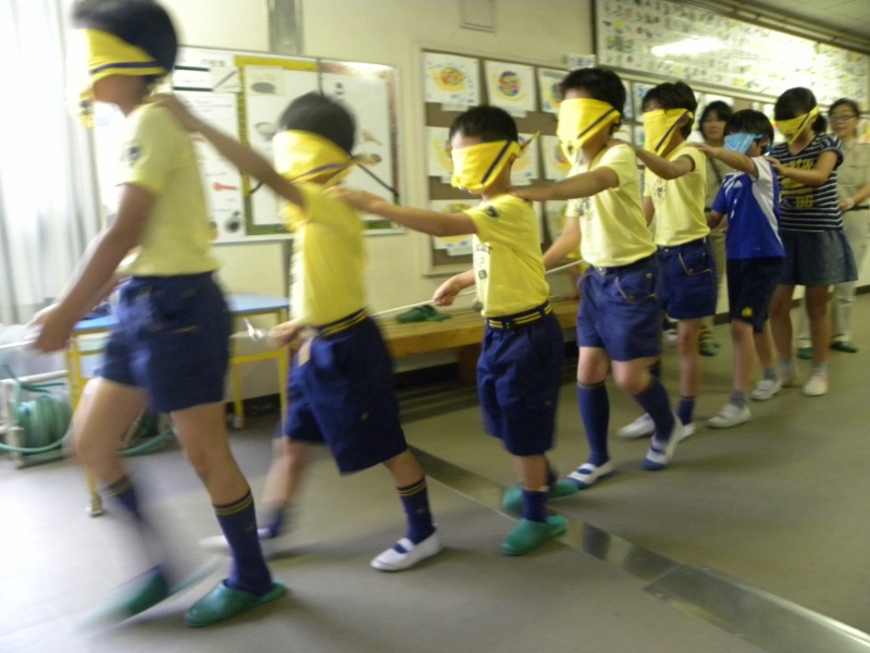 みんな目隠しをして、ロープに沿ってゴールまでのタイムを競いました。