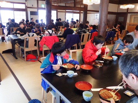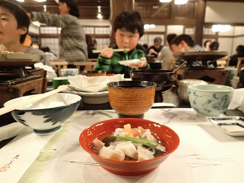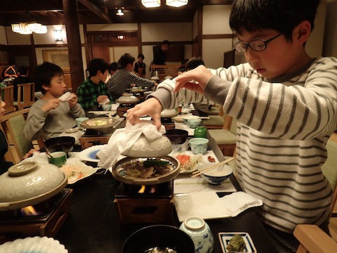 大人にとってはとても楽しみな旅館のお料理ですが、カブスカウトたちにとっては、品数の量と、食べ慣れない山菜など、なかなか大変なんですよ。彼は憂鬱な人〜。