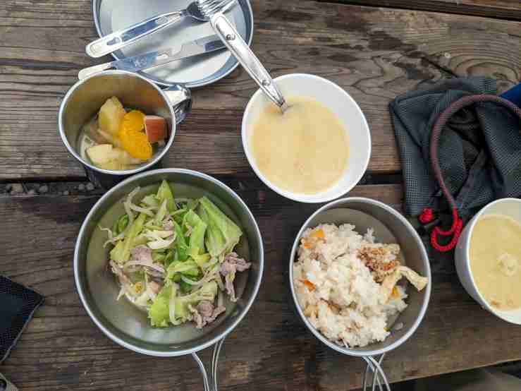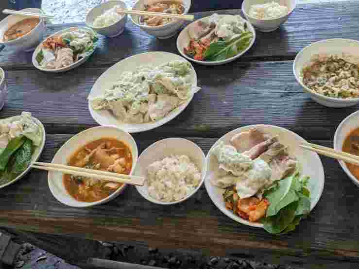 リーダー飯は「豆腐チゲ、浅漬けキムチ、ゆで豚、手作り水餃子、白ご飯、パイナップルの丸焼き」